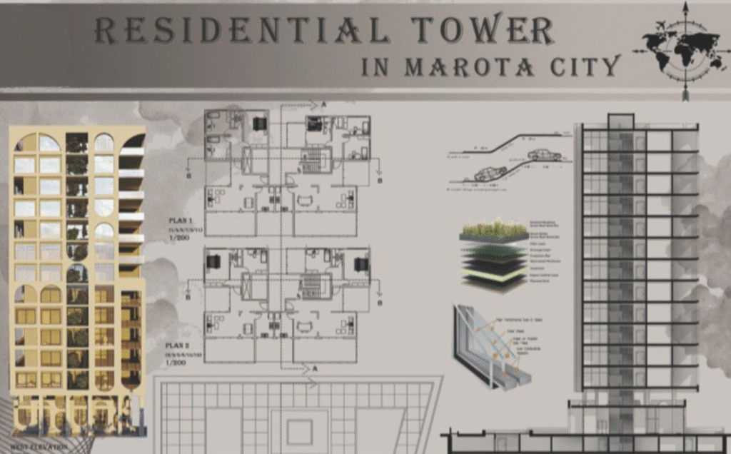 يمثل مشروع البرج السكني في ماروتا سيتي رؤية معمارية حديثة تجمع بين الطابع الجمالي والوظيفي، حيث صُمم بواجهات مميزة تعتمد الأقواس والمساحات الزجاجية الواسعة لخلق هوية معاصرة منفتحة على الضوء والطبيعة. يضم البرج شققاً سكنية متنوعة، ومرافق خدمية وترفيهية مثل النادي الرياضي وقاعة متعددة الاستعمالات ومساحات مخصصة للأطفال، إضافةً إلى دمج العناصر الخضراء الرأسية والأسطح المستدامة، بما يعكس نموذجاً متكاملًا للحياة العصرية داخل المدينة
