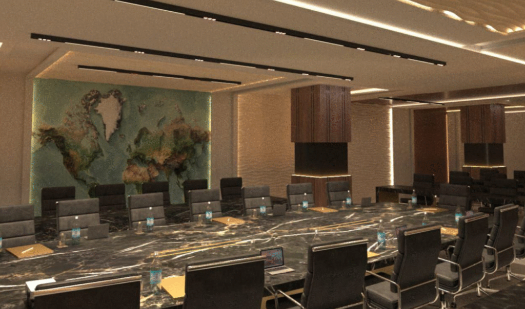 قاعة اجتماعات في فندق بلانيت بتصميم عصري متكامل، تجمع بين الأناقة والعملية، تتميز بطاولة مركزية كبيرة من الرخام الفاخر تتسع لعدد كبير من الحضور، محاطة بمقاعد مريحة ذات طابع إداري فاخر، الجدران مزودة بعناصر ديكورية حديثة، منها لوحة جدارية فنية بخريطة عالمية تضفي بعداً بصرياً مميزاً وتعكس الطابع الدولي للمكان، الإضاءة موزعة بشكل مدروس بين إضاءات مخفية دافئة وإضاءة مباشرة تعزز التركيز، مع لمسات خشبية أنيقة تضفي دفئاً على الأجواء. كما أن القاعة مجهزة بأحدث وسائل العرض والتقنيات السمعية والبصرية، لتوفير بيئة مثالية لعقد الاجتماعات والمؤتمرات الرسمية في أجواء مريحة واحترافية